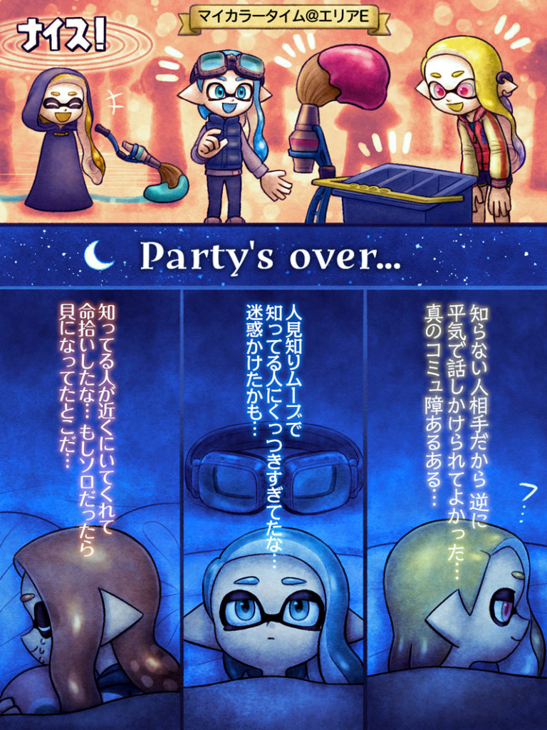 夜回り先の方々がよく展示準備されていて気になっていたマイカラータイム(オリジナル🦑🐙webオンリーイベント)に一般参加でお邪魔してきた 写真撮影後の歓談タイムは近くにいてくれた人みなトークうまくて和気あいあいと楽しい時間を過ごせたけど 解散後にそれぞれのSNSアカウント上で自虐気味に反省を語る投稿を見かけて笑ってしまった わかりみがすぎて…😂 陽気に見えて意外と繊細なウェービーズ ナイス (2025.09.28)